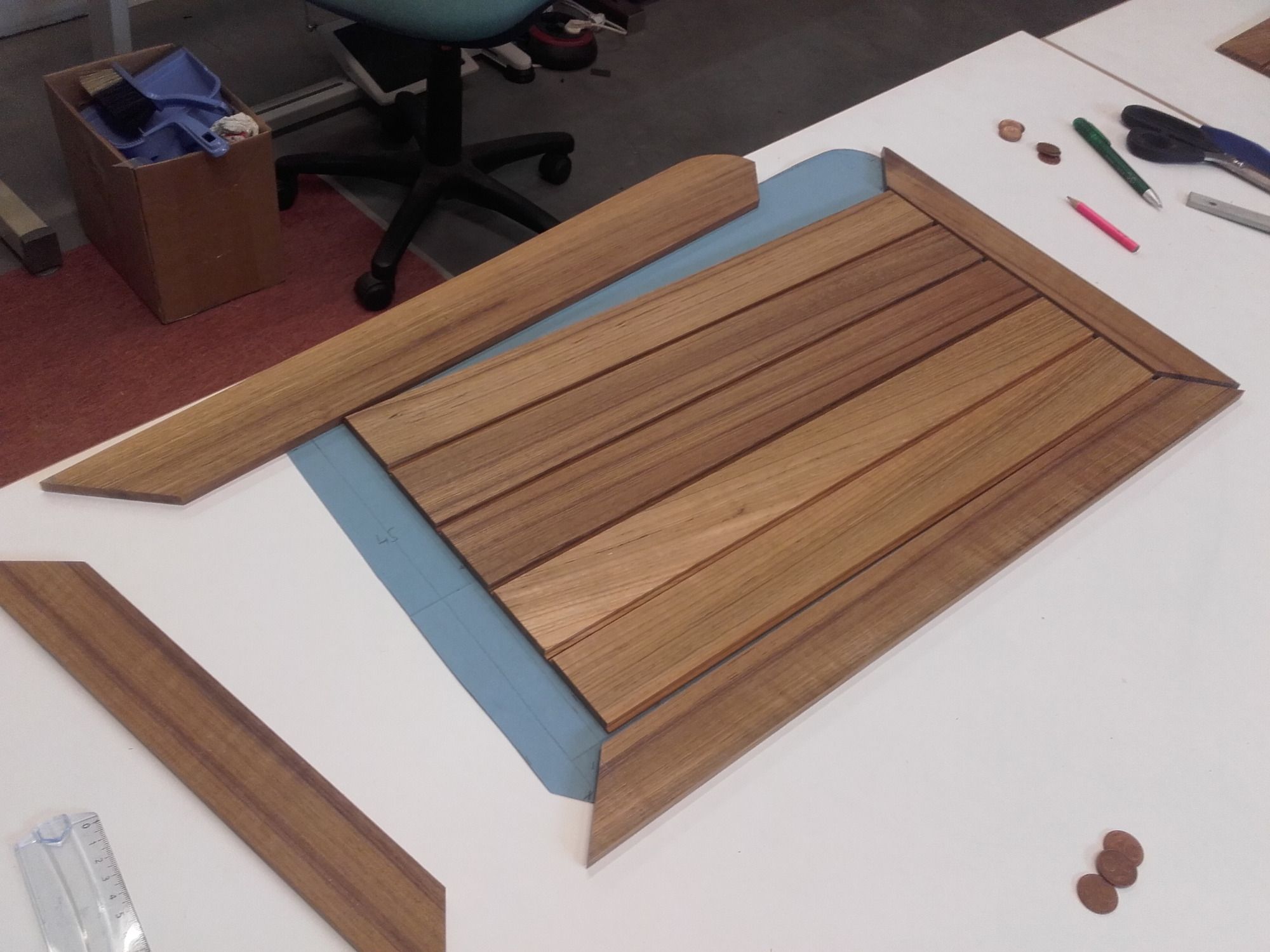 Das Cockpit der Miss Eva erhält neues Teak. Nach der Verklebung wird mit 290DC verfugt.